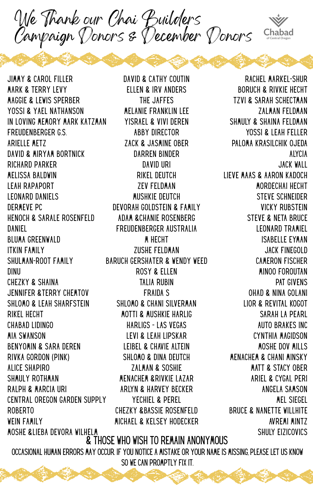 Chabad Lubavitch of Central Oregon, Inc. is a 501(c)(3) charitable organization. Your contribution is tax deductible.
