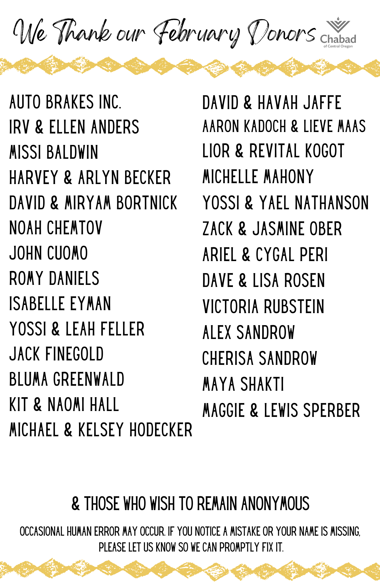 CHECK - Payable to Chabad of Central Oregon